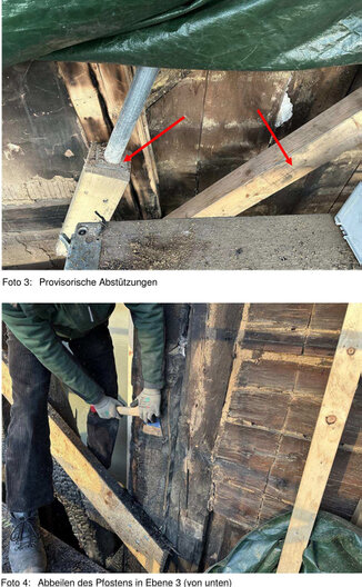 Momentan werden die Schäden an der Ostseite nach und nach behoben. Dafür müssen verbrannte Teile des Fachwerks bis hoch zum Brandgiebel ersetzt werden, um die Statik zu sichern. Das ist ein sehr aufwendiges Vorhaben – siehe Video.