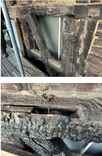Momentan werden die Schäden an der Ostseite nach und nach behoben. Dafür müssen verbrannte Teile des Fachwerks bis hoch zum Brandgiebel ersetzt werden, um die Statik zu sichern. Das ist ein sehr aufwendiges Vorhaben – siehe Video.